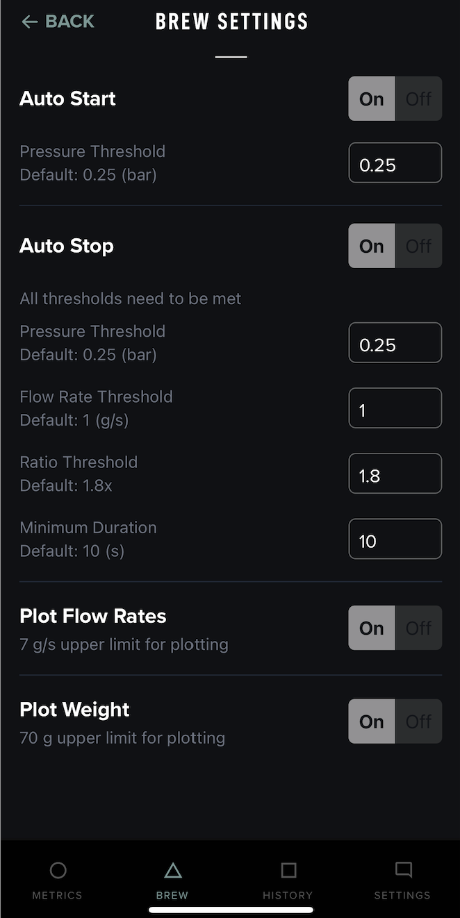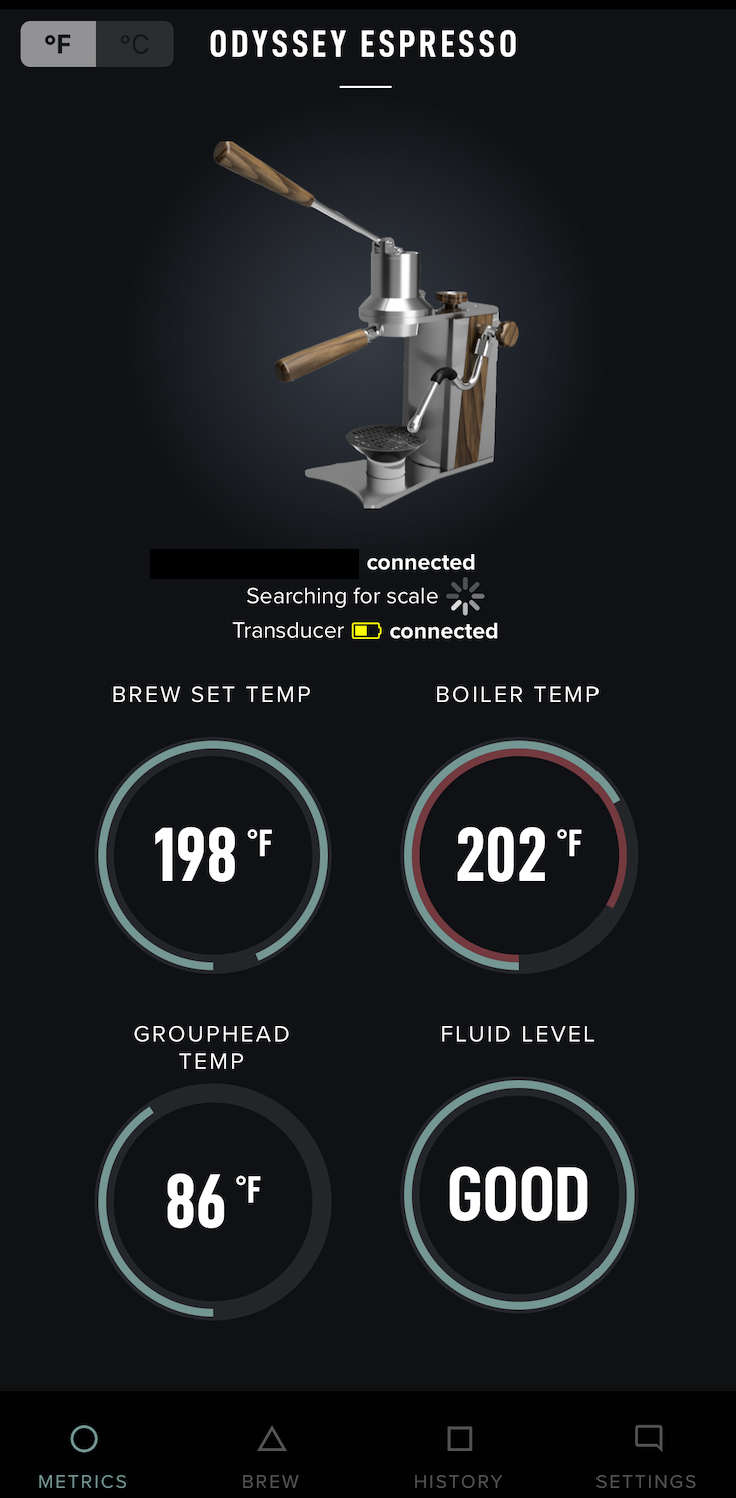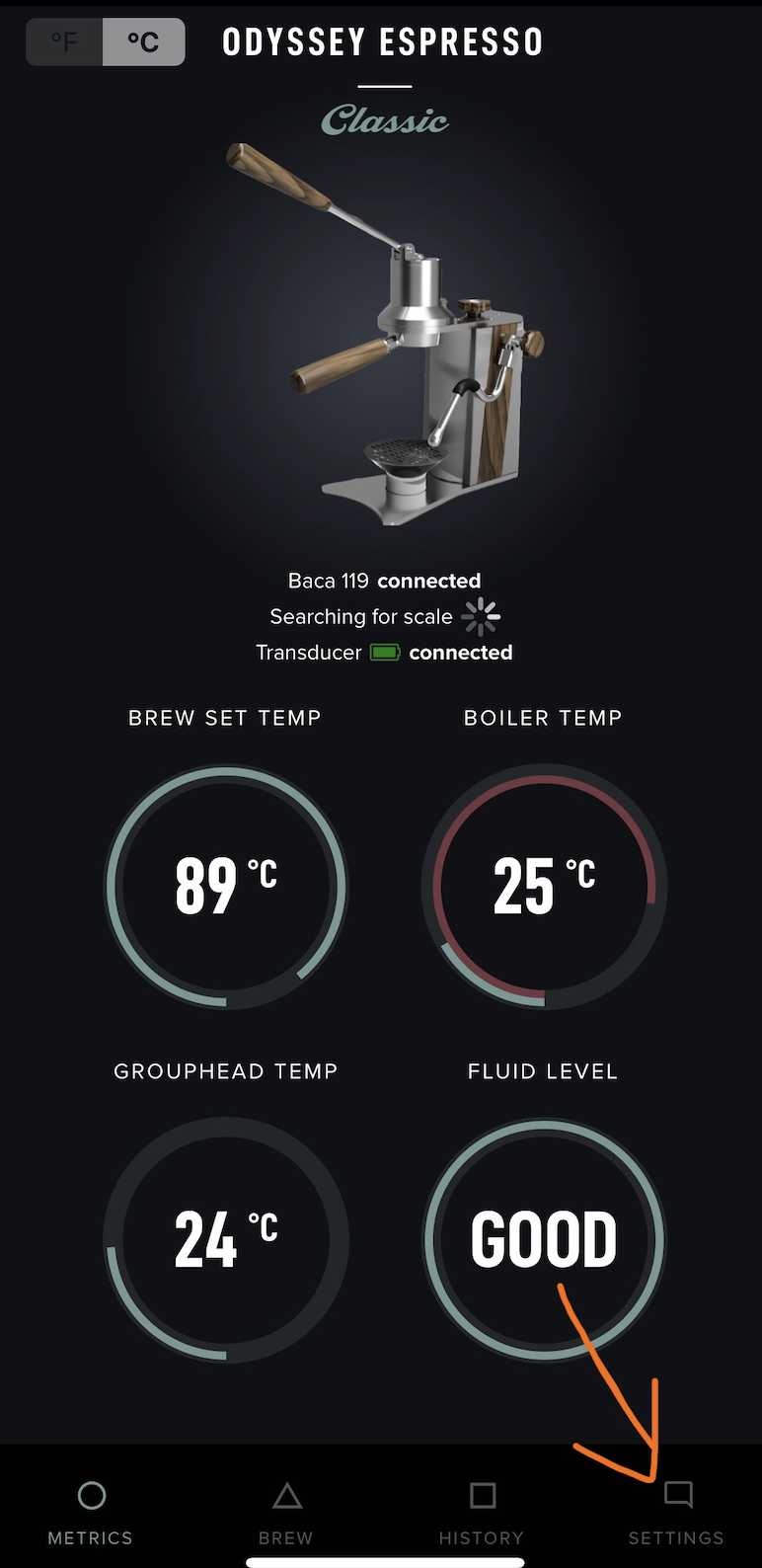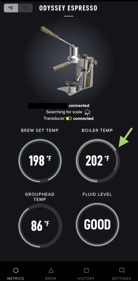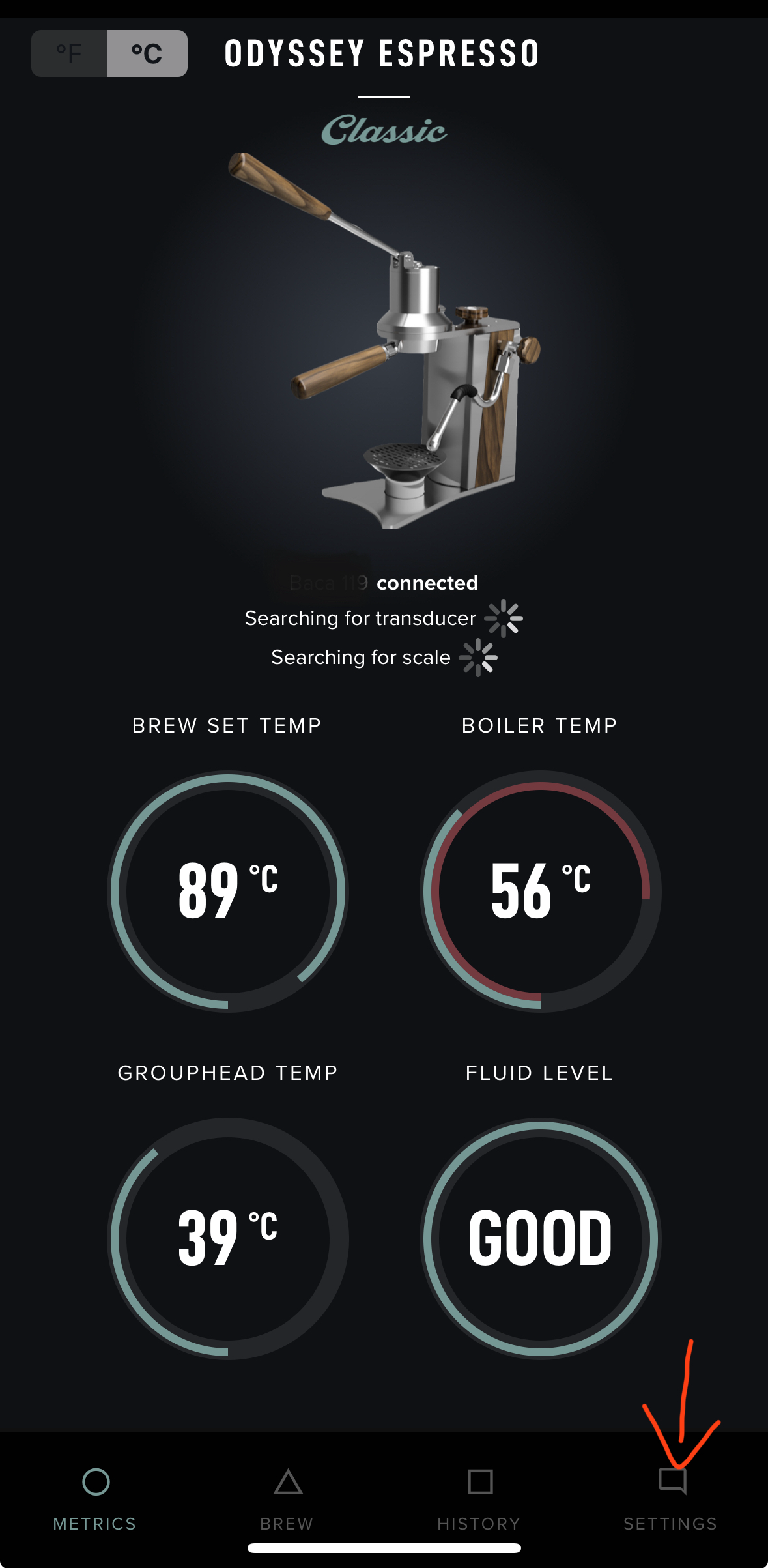 In addition to showing the boiler level and brew set temperature, the Metrics page of the app provides detailed insights into your machine’s performance, including: