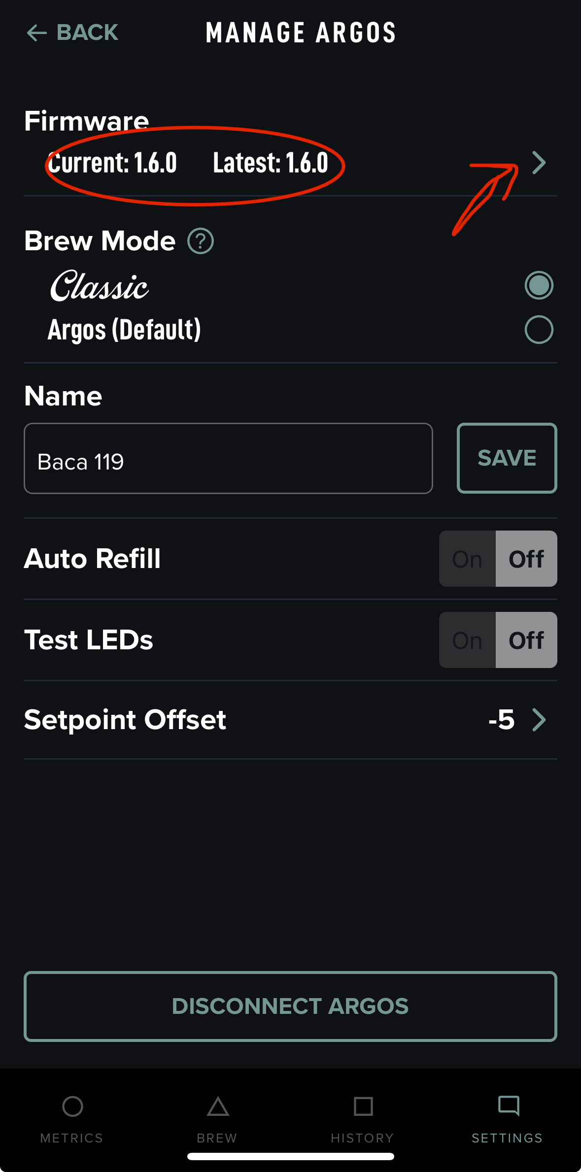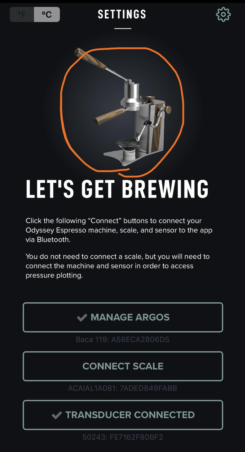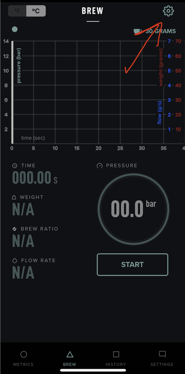 On the Brew page of the app, tap the gear icon in the top-right corner.
